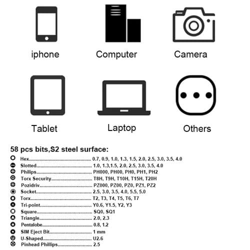 El kit contiene 80 herramientas multifuncionales diseñadas para cubrir una amplia variedad de tornillos comunes en Teléfonos Móviles y dispositivos electrónicos.