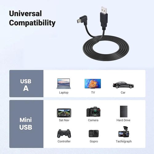 • Longitud de 1,5 metros, con Conector Mini B de 5 pines en orientación Izquierda; Conectores chapados en oro para mejor conductividad; velocidad de transferencia compatible con USB 2.0