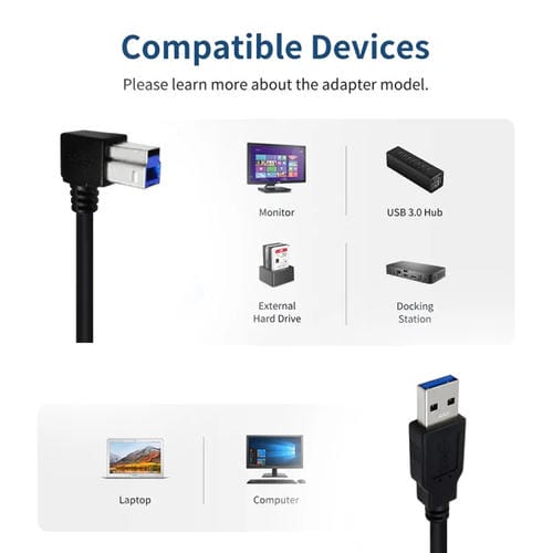 Este Cable es adecuado para impresoras que utilicen el Conector USB 3.0 B macho con orientación Izquierda. Es importante verificar el tipo de Puerto USB-B de su dispositivo antes de la compra. -