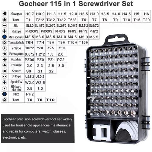 - Conjunto de 115 Piezas que incluye 98 puntas de precisión (Hexagonal, Philips, Cruz, Menos, Torx, Seguridad Torx, Destornillador de tuercas, Tipo Y, Pentágono, Triángulo, Tipo U, cabeza plana, Bits cuadrados y especiales), mango telescópico, ejes de extensión, pinzas, ventosa, herramientas de palanca y accesorios para magnetización y extracción de Tarjetas SIM