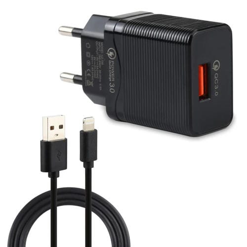 Cargador de viaje Lz-728 2 en 1 18W QC 3.0 con USB y cables USB a 8 pines (Negro)