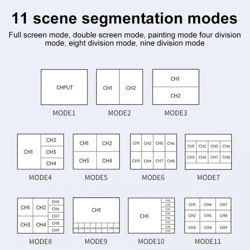 • Soporta 11 modos de división de Pantalla (Pantalla Completa, dual, imagen fuera de imagen, cuatro, ocho y nueve divisiones); entrada HDMI x9; salida HDMI x1; resolución máxima 4K 30Hz; ancho de Banda 60Hz; fuente de Alimentación CC 12 V 2 A; dimensiones 288x89,6x22,3 mm; peso 0,67 kg; rango de temperatura de trabajo -50 a 80 °C