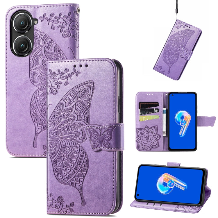 Estuche para Asus Zenfone 9 Butterfly Love Flower en Cuero en Relieve (Lavanda)