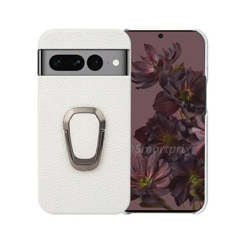 Funda de Cuero Genuino para Google Pixel 7 Pro con Ring Holder y Textura Litchi (Blanco)