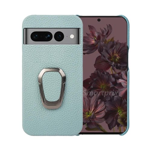 Funda para Google Pixel 7 Pro con Ring Holder y Textura Litchi de Cuero Genuino (Cian)