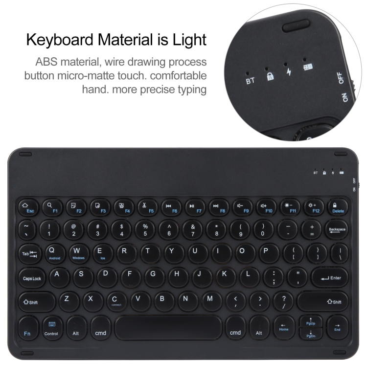 - Soporte giratorio multiángulo; Teclado Bluetooth desmontable con Conexión Inalámbrica hasta 10 metros; Teclas silenciosas; Batería de litio con duración aproximada de 100 horas y vida útil de 3 años; corriente de funcionamiento 500 mA; vida útil de las Teclas de hasta 5 millones de pulsaciones.