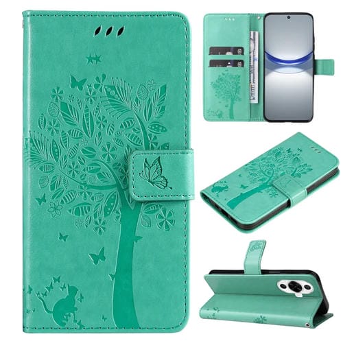 Funda para Huawei Nova 12S de Cuero con Tapa y Patrón en Relieve de Árbol y Gato (Verde)