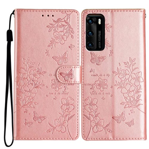 - 1x Funda de Cuero para Huawei P40 con Relieve de Flor de Amor y Mariposa (Oro Rosa)