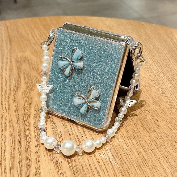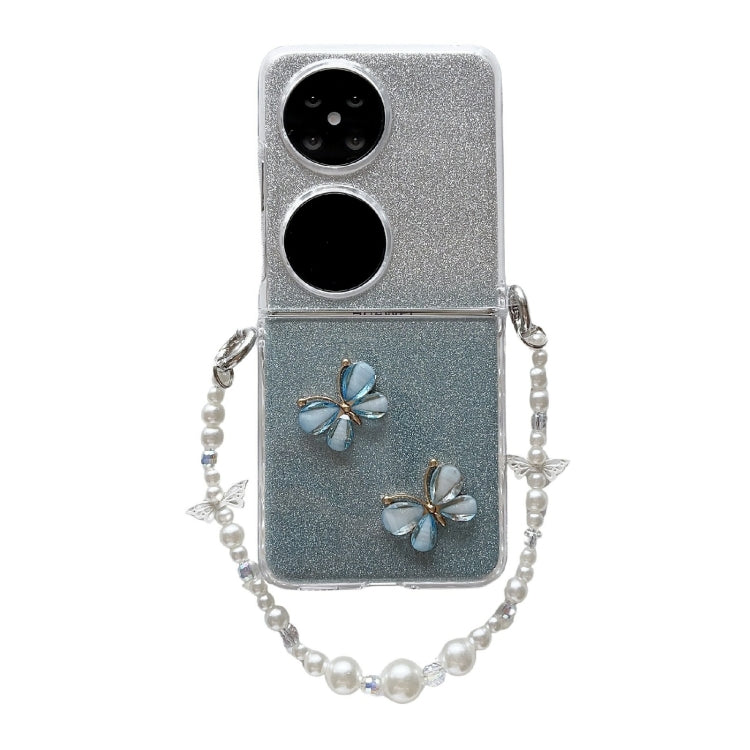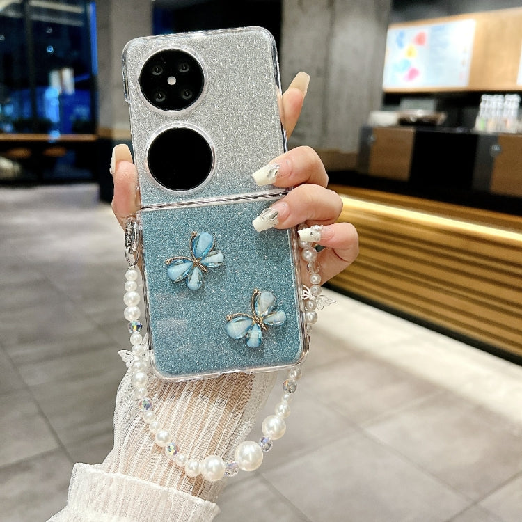 Funda para Huawei P50 Glitter Powder 3D Butterfly PC con Hebilla Lateral y Pulsera de Perlas (Azul)