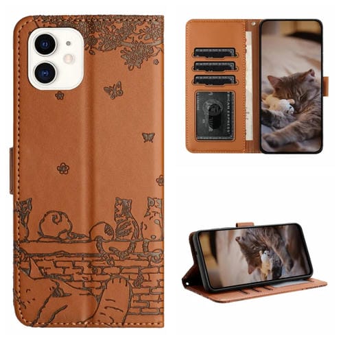Funda para Teléfono iPhone 11 Cat Relieve Patrón de Cuero con Cordón (Marrón)