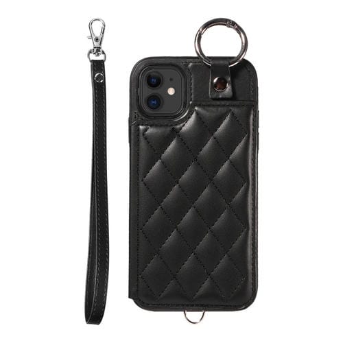 Estuche para Teléfono iPhone 11 con Bolsa para Tarjetas Textura Rómbica y Cordón Corto (Negro)
