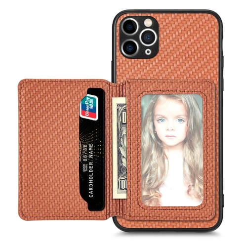 Caja de teléfono para iPhone 11 Pro con bolsa de tarjeta magnética de fibra de carbono (Marrón)