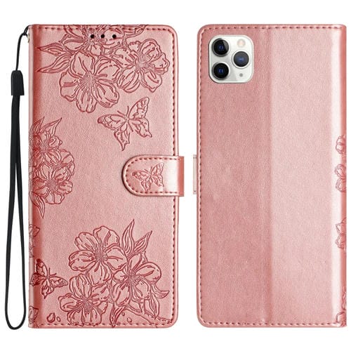 Funda para teléfono iPhone 11 Pro Cherry Blossom Butterfly Skin Feel PU en relieve (Oro Rosa)