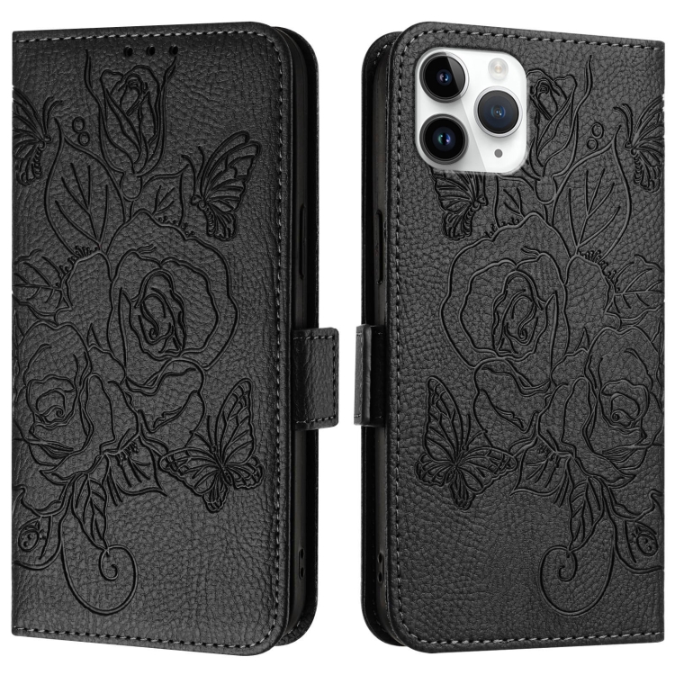 Estuche para teléfono iPhone 11 Pro cuero antirrobo RFID con rosa en relieve (Negro)