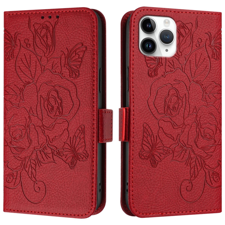 Estuche para teléfono iPhone 11 Pro cuero antirrobo RFID con rosa en relieve (Rojo)