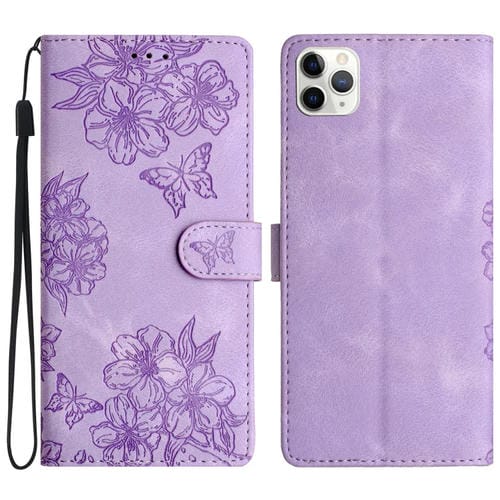 Funda para teléfono iPhone 11 Pro Max Cherry Blossom Butterfly Skin Feel de PU en relieve (Púrpura)