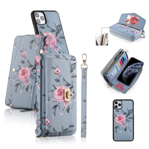 Funda de Cuero Pola Flower para iPhone 11 Pro Max con Billetera Cruzada Multifuncional y Cremallera (Azul)