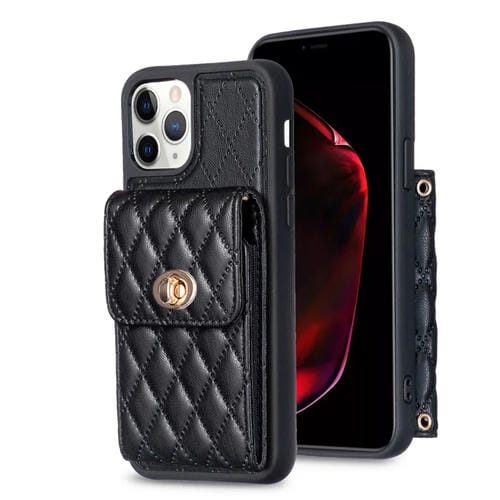 Funda para iPhone 11 Pro Max Vertical Metal Hebilla Monedero Rombico Cuero (Negro)