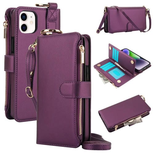 Funda para Teléfono iPhone 12 Mini Cuero con Billetera Multifuncional y Anillo Cruzado (Púrpura Oscuro)
