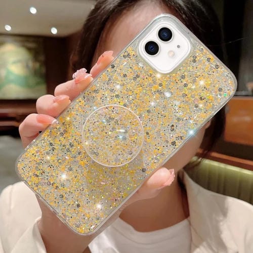 Funda para Teléfono TPU Epoxi iPhone 12 Mini con Soporte Redondo y Lentejuelas Estrelladas (Amarillo)