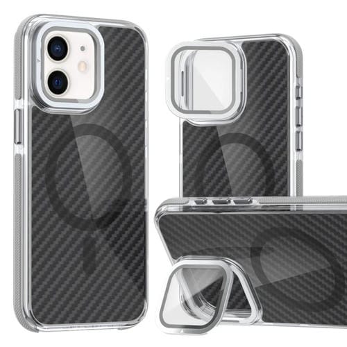 Estuche para Teléfono iPhone 12 Pro / 12 Magsafe con Película de Lente Fibra de Carbono y Soporte Plegable (Gris)