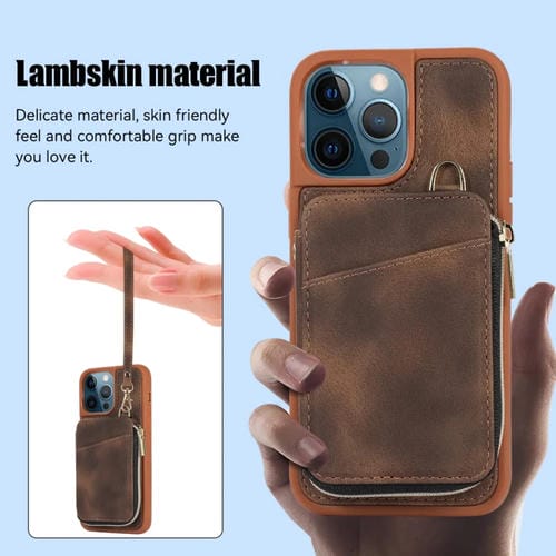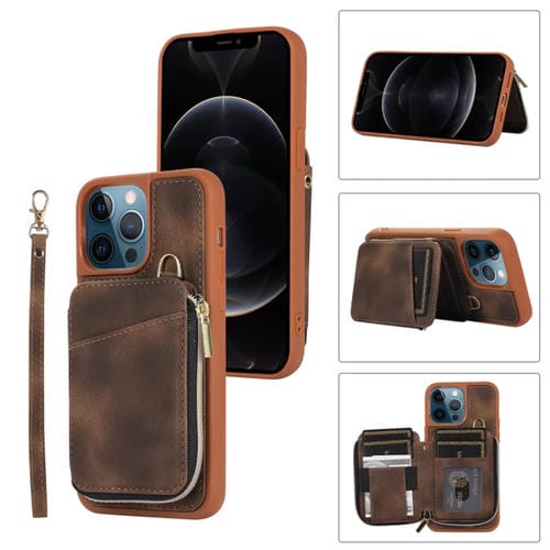 Funda para Teléfono iPhone 12 Pro Max Zipper Card Bag Contraportada (Marrón)