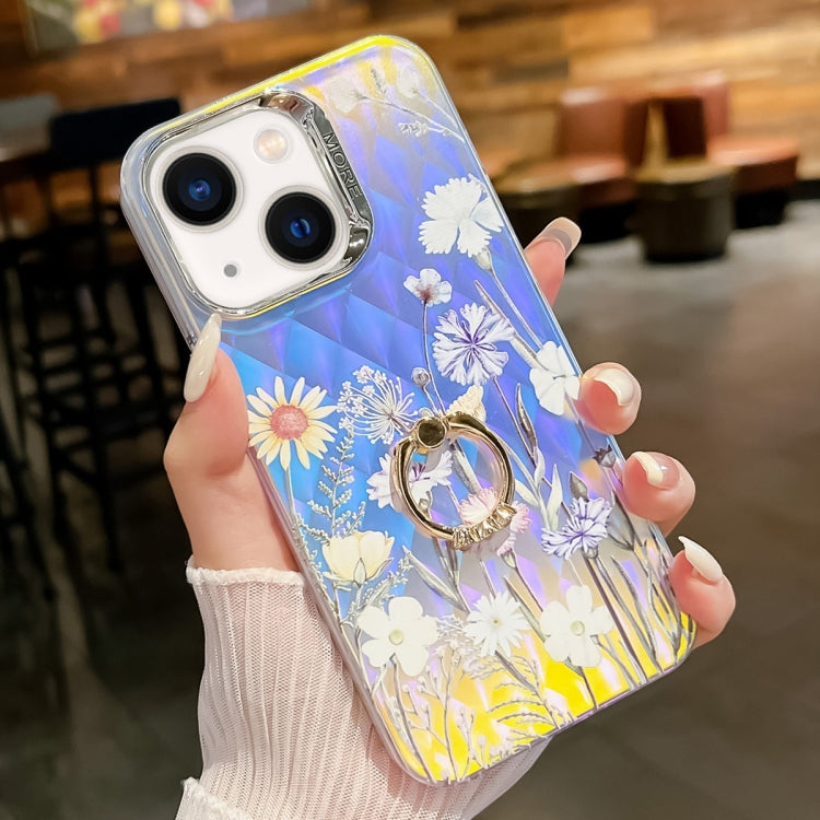 Caja teléfono TPU para iPhone 13 con Soporte Anillo Flor Láser Galvanoplastia (Crisantemo)