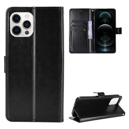 Funda de Cuero Crazy Horse para iPhone 13 Mini con Tapa Horizontal, Soporte, Ranuras para Tarjetas y Cordón (Negro)