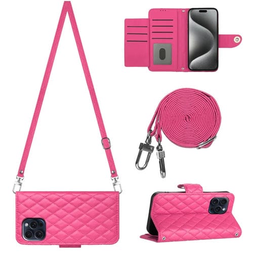 Funda para Teléfono iPhone 13 Pro Cuero con Tapa Textura Rómbica y Cordón Largo (Rojo Rosa)