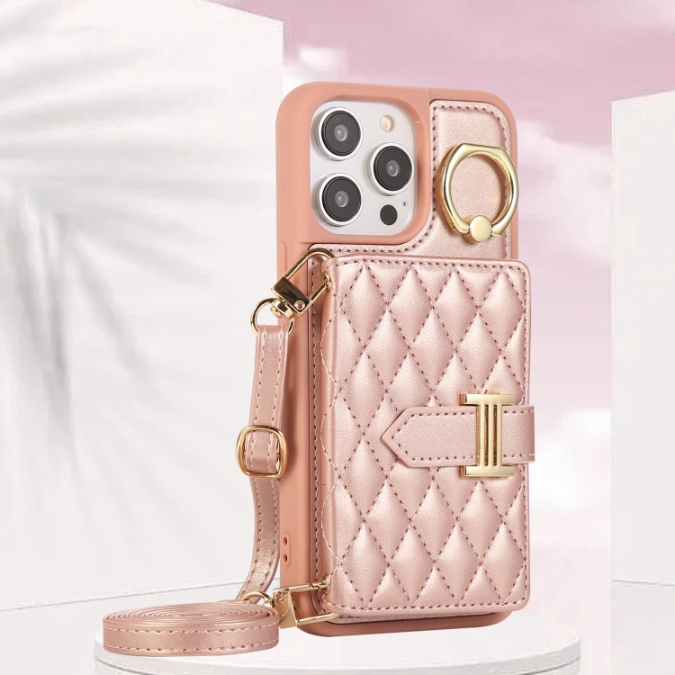 Funda para iPhone 13 Pro Horizontal Card Bag Ring Holder con Doble Cordón (Oro Rosa)