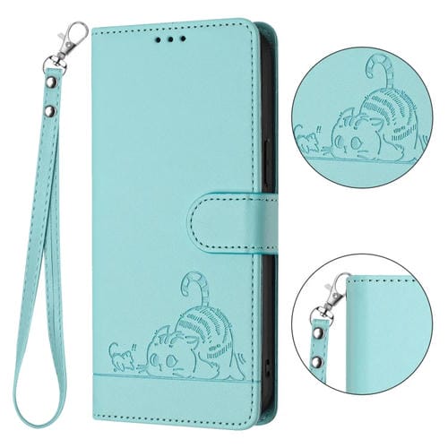 Estuche para Teléfono iPhone 13 Pro Max Cat Rat con Patrón En Relieve Rfid Pu con Correa para la Muñeca (Verde Menta)
