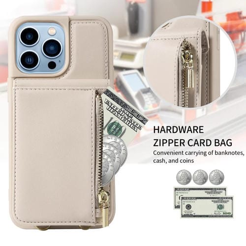 Funda para iPhone 13 Pro Max Crossbody Lanyard Zipper Wallet Leather Phone Case (Beige)