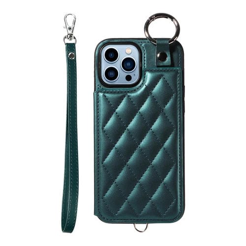 Estuche para teléfono iPhone 13 Pro Max con bolsa para tarjetas textura rómbica y cordón corto (Verde)