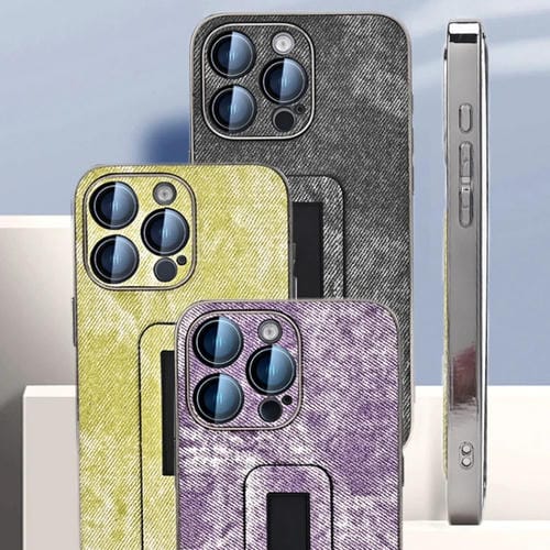 Funda para iPhone 13 Pro Max Patrón de Mezclilla Caja de Enfriamiento con Soporte Push-Pull Galvanizado (Amarillo Verde)