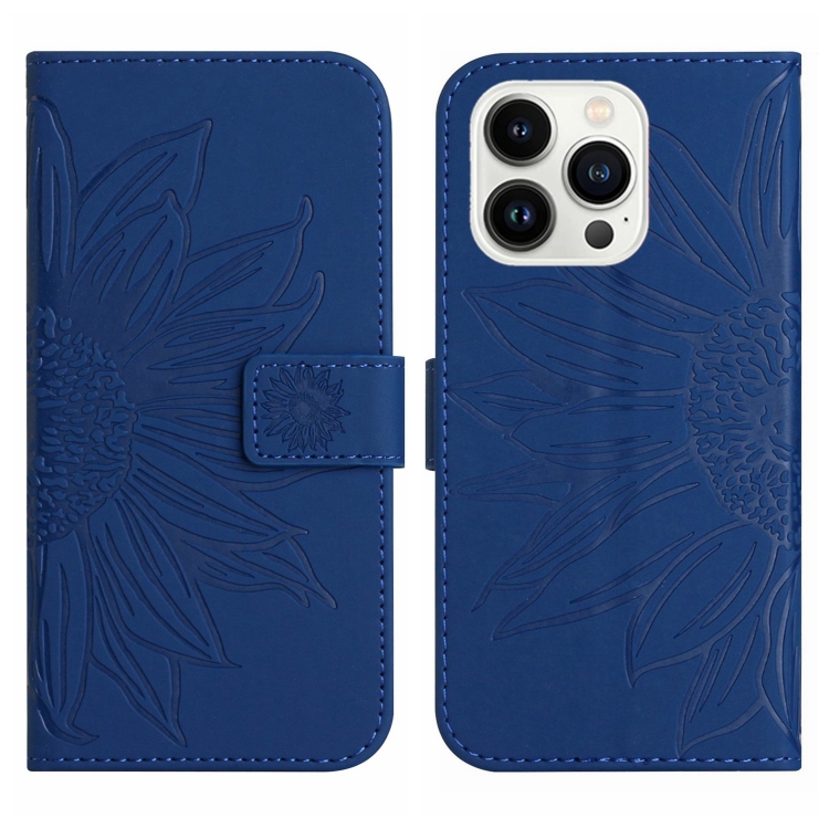 Funda Flip de Cuero para iPhone 13 Pro Skin Feel Sun Flower Pattern con Cordón (Azul Oscuro)