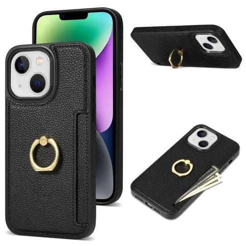 Funda Trasera para iPhone 13 Ring Card Litchi de Cuero (Negro)