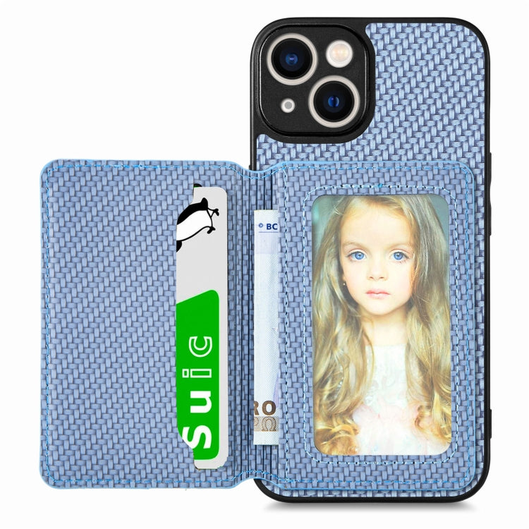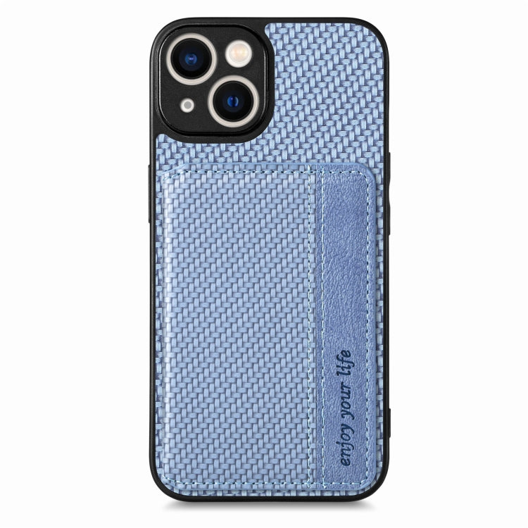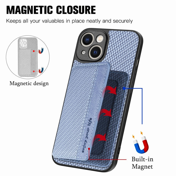 Caja de teléfono para iPhone 14 con bolsa de tarjeta magnética de fibra de carbono (Azul)