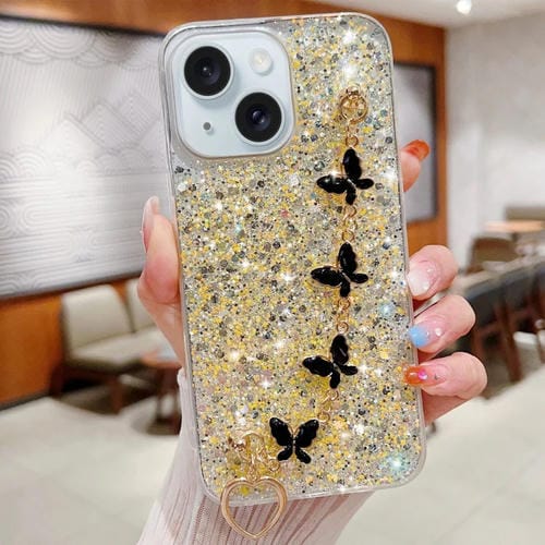 Funda para teléfono TPU Epoxi iPhone 14 con Cadena de Mariposa y Lentejuelas Estrelladas (Amarillo)
