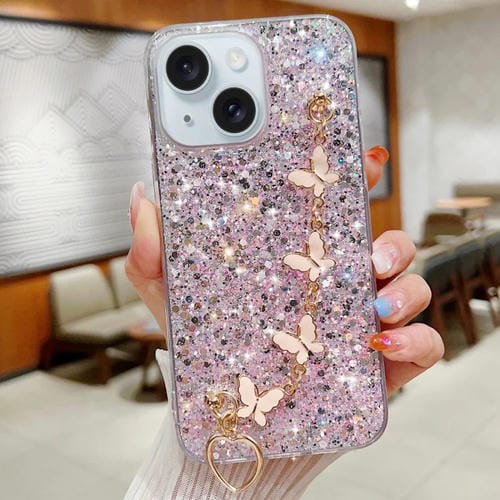 Funda para Teléfono iPhone 14 TPU Epoxi con Cadena de Mariposa y Lentejuelas Estrelladas (Rosa)