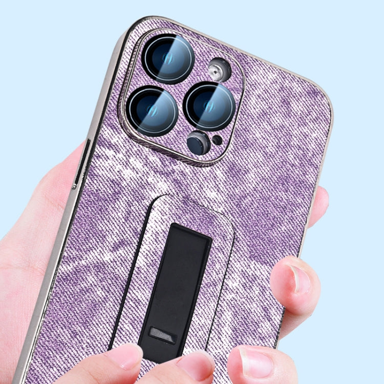 Funda para Teléfono iPhone 14 Pro Refrigeración Soporte Push-Pull Galvanizado Patrón Mezclilla (Amarillo Verde)