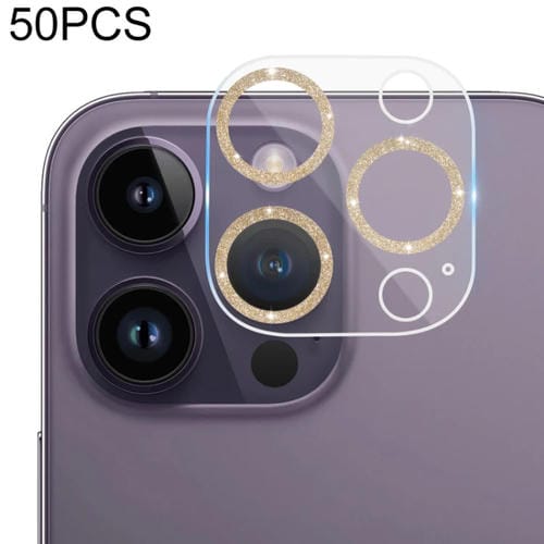 Vidrio templado para iPhone 14 Pro Max y 14 Pro protección cámara Trasera brillo Cd textura 50PCs (Oro)