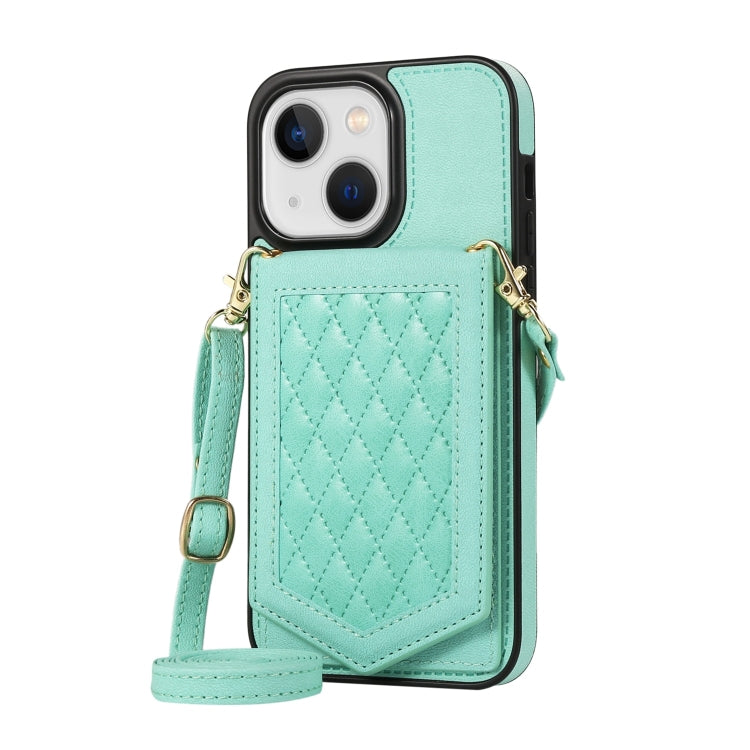 Funda para iPhone 14 Rhombic Texture Rfid con Cordón y Espejo (Verde Menta)