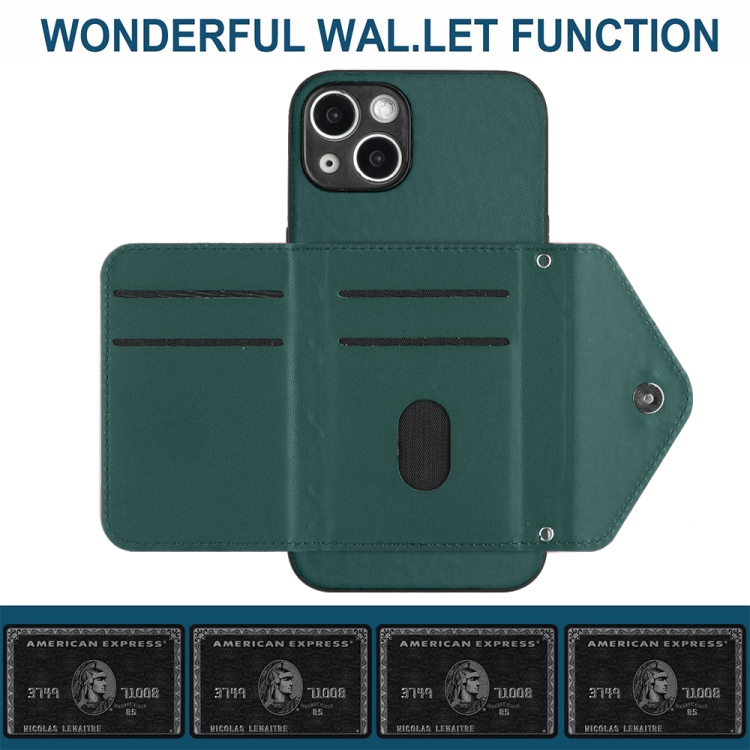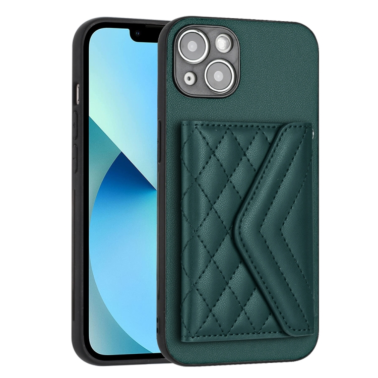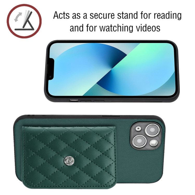 Estuche para Teléfono iPhone 15 con Bolsa para Tarjetas Rfid Textura Rómbica Cordón Largo (Verde)