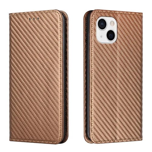 Funda de Teléfono para iPhone 15 Cuero con Soporte y Textura de Fibra de Carbono (Marrón)