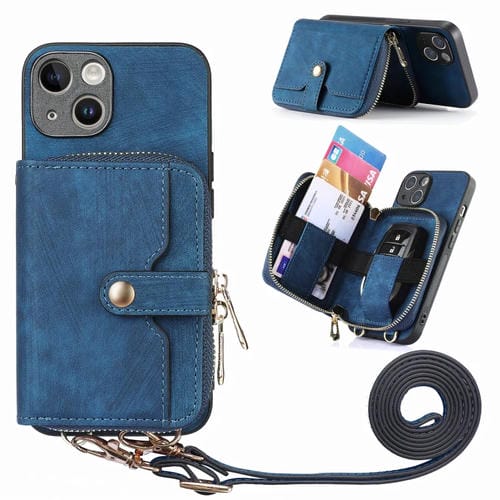 Funda para Teléfono iPhone 15 con Billetera y Cremallera Multifunción Cruzada (Azul)