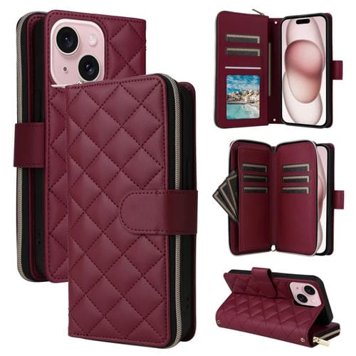 Funda para Teléfono iPhone 15 Cuero Hebilla Torre Cremallera Rombal Cruzada Cordón (Rojo Vino)