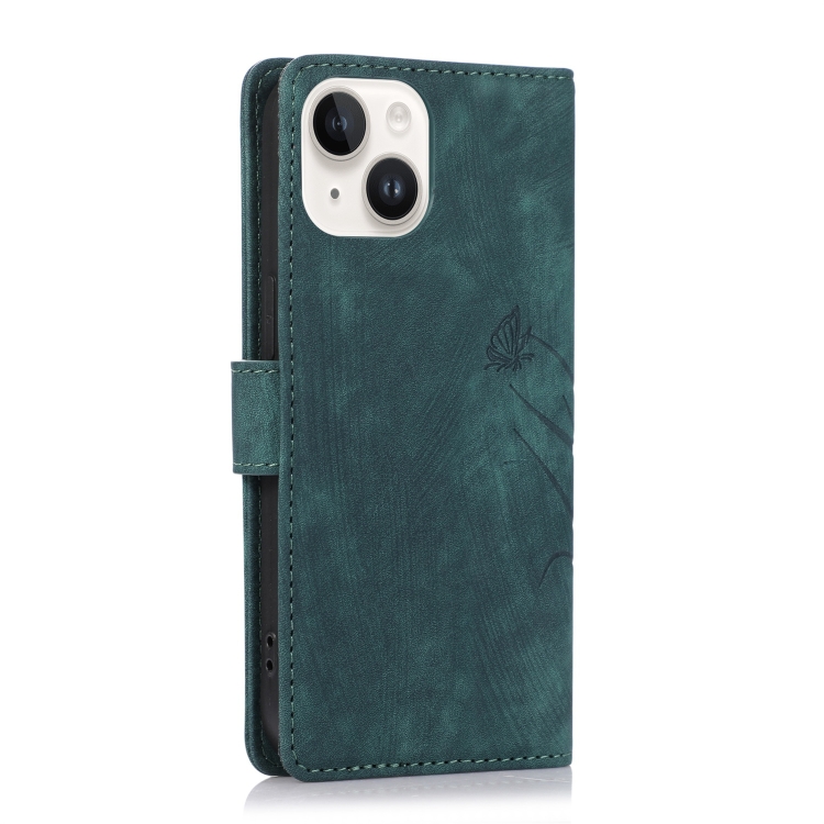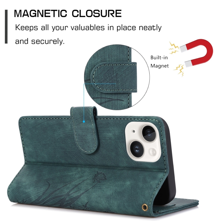 Funda para Teléfono iPhone 15 Cuero con Relieve Mariposa Orquídea (Verde)