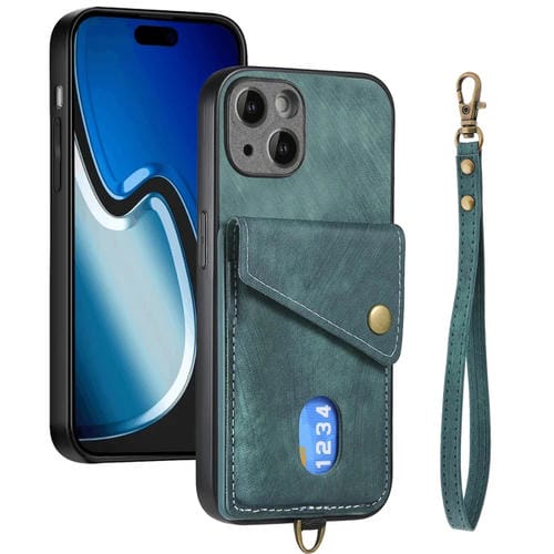 Funda para Teléfono iPhone 15 Cuero Plegable con Billetera y Tarjeta Retro con Correa (Verde)