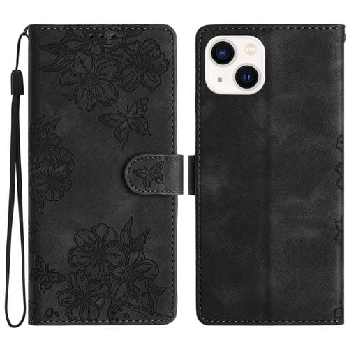 Funda para Teléfono iPhone 15 PU Sensación de Piel Mariposa y Flor de Cerezo En Relieve (Negro)