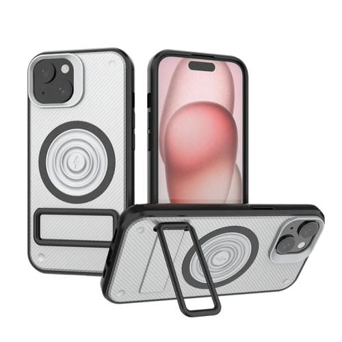 Funda para Teléfono iPhone 15 PC + TPU Textura Fibra de Carbono con Soporte de Metal (Blanco)